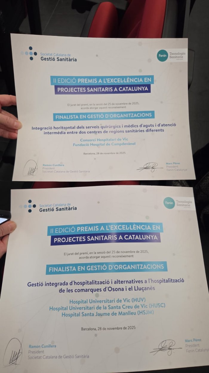 D'altra banda, també ha estat finalista el projecte "Gestió integrada d'hospitalització i alternatives a l'hospitalització de les comarques d'Osona i el Lluçanès". Aquest treball aprofundeix en el model d'atenció integrada, posant el focus en les alternatives a l'ingrés convencional per oferir una resposta més adaptada a les necessitats dels pacients del territori. Aquest projecte comptava amb la participació de l'Hospital Universitari de Vic, l'Hospital de Sant Jaume de Manlleu i l'Hospital Universitari de la Santa Creu de Vic.