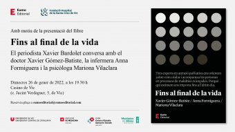 El Casino de Vic acollirà el proper 26 de gener, a les 19:30h, la presentació del llibre 'Fins al final de la vida', escrit per Mariona Vilaclara, psicooncòloga de l'Hospital Universitari de Vic, juntament amb Anna Formiguera, infermera de la Unitat de Cures Pal·liatives de l'Hospital Universitari de la Santa Creu de Vic, i Xavier Gómez-Batiste, referent mundial en aquest àmbit.