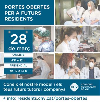La jornada de portes obertes per a futurs residents del CHV es farà el dimarts 28 de març, a partir de les 11:00 h, a l'Hospital Universitari de Vic, amb una part virtual i una altra presencial.