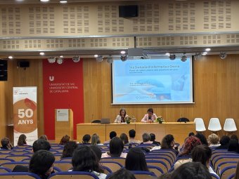 L'Aula Magna de la UVic-UCC va acollir la 14a Jornada d'Infermeria a Osona que, amb el lema "Les nostres infermeres, el nostre futur", va arrencar amb la conferència "Salut: nou ecosistema de benestar", de Neus Domènech Oller, infermera i responsable d'Innovació de la Fundació Hospital d'Olot i Comarcal de la Garrotxa.
